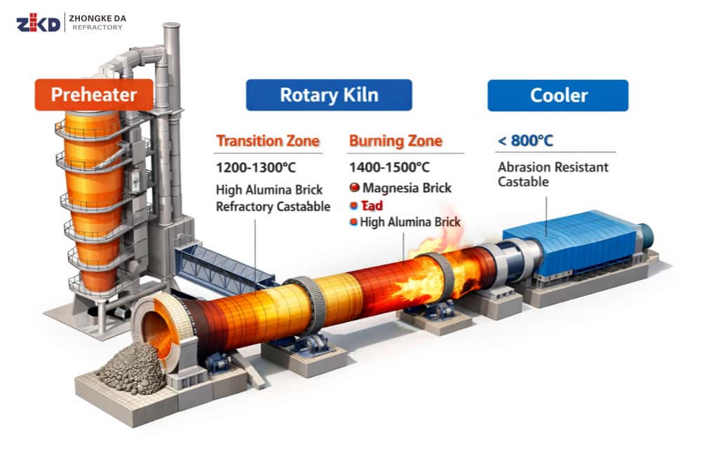 Different kiln zones require different materials to withstand heat, abrasion, and chemical attack.